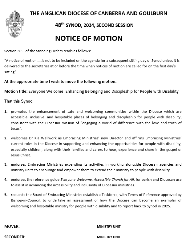 Undertake an assessment of how the Diocese can become an exemplar of welcoming and hospitable ministry for people with disability and to report back to Synod in 2025.